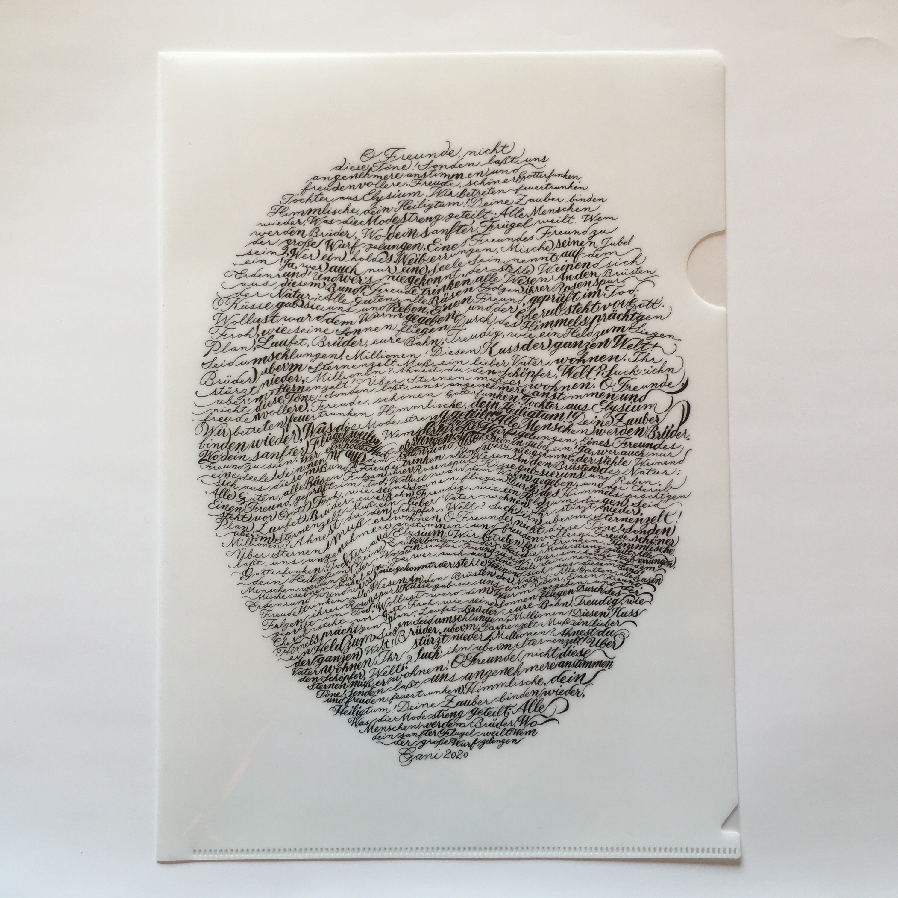 ベートーヴェン(1770〜1827)の交響曲第9番 第4楽章「歓喜の歌」のドイツ語歌詞で、彼の顔を描いた文画作品をプリントしたA4クリアファイルです。