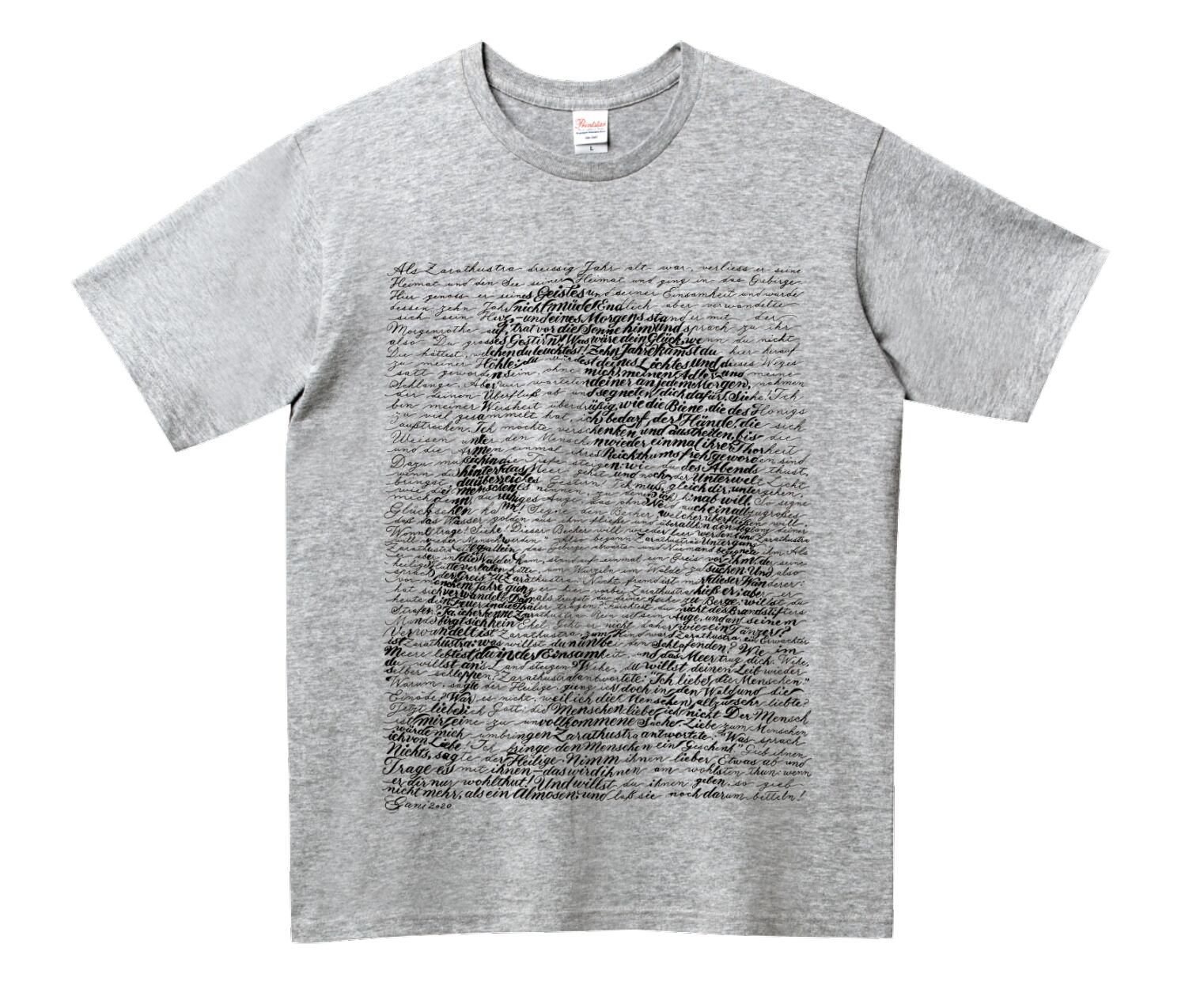 ニーチェ(1844〜1900)の代表的著作『ツァラトゥストラはかく語りき』の冒頭部分の文章を手書きしながら彼の肖像を描いた文画作品を、Tシャツにプリントしました。
